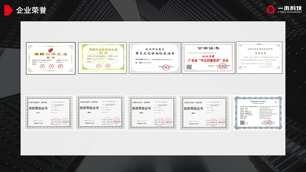 深圳市一禾音視頻科技有限公司創(chuàng)立于2001年,為國(guó)家高新技術(shù)企業(yè),深圳市高新技術(shù)企業(yè),重點(diǎn)文化企業(yè),廣東省守合同重信用企業(yè),通過(guò)了國(guó)家貫標(biāo)知識(shí)產(chǎn)權(quán)體系認(rèn)證、ISO9001質(zhì)量管理體系認(rèn)證、ISO14001環(huán)境管理體系認(rèn)證、OHSAS18001職業(yè)健康管理體系認(rèn)證。