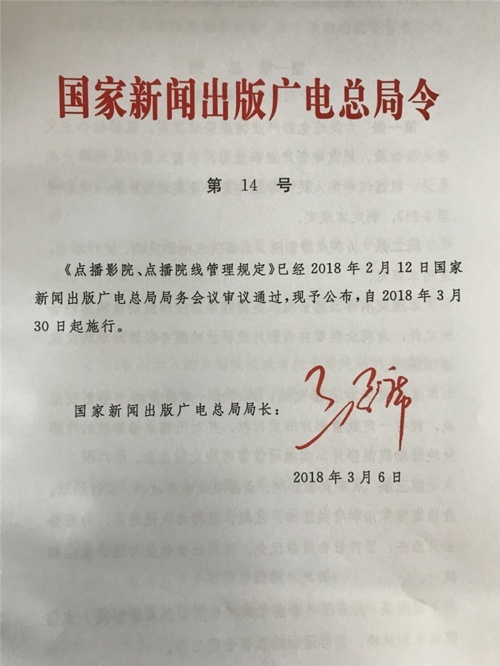 國家新聞出版廣電總局令第14號日前已簽署公布。該文件內容為:《點播影院、點播院線管理規(guī)定》已經(jīng)2018年2月12日國家新聞出版廣電總局局務會議審核通過,現(xiàn)予公布,自2018年3月30日起施行。