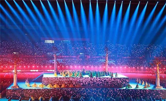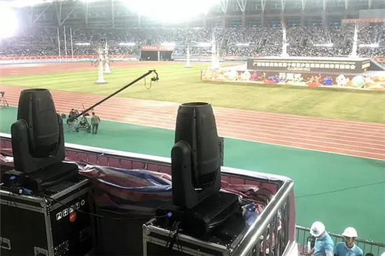此次項目使用了珠江燈光上百臺尊能系列光束、切割、染色三款產品,在建筑面積46534平方米內的體育場內,尊能系列燈光效果非常突出,遠程距離的投射還保持光色飽滿的力度,同時擁有高亮度和高顯指數(shù),高度還原民族服飾特色色彩。