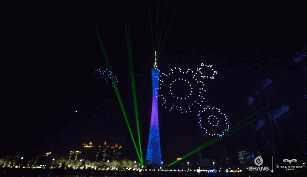 在開幕式當(dāng)晚300架無人機(jī)融入到燈光秀表演中與廣州塔花城廣場(chǎng)共同奉上一場(chǎng)“會(huì)講故事的大秀”。