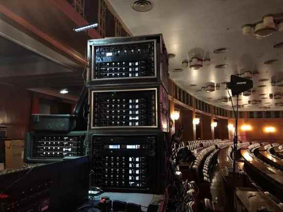 雖然如此,本著盡善盡美的原則,工程師們還在舞臺(tái)上架設(shè)的天線方面做了周密的布置。一組天線架設(shè)于觀眾席后方調(diào)音臺(tái)區(qū)域,另外一組天線架設(shè)在舞臺(tái)上,由于舞臺(tái)距接收機(jī)距離較遠(yuǎn),并且現(xiàn)場(chǎng)對(duì)鋪設(shè)線纜要求極高,所以舞臺(tái)上天線采取光纖回傳射頻信號(hào)方案(RFoF)。