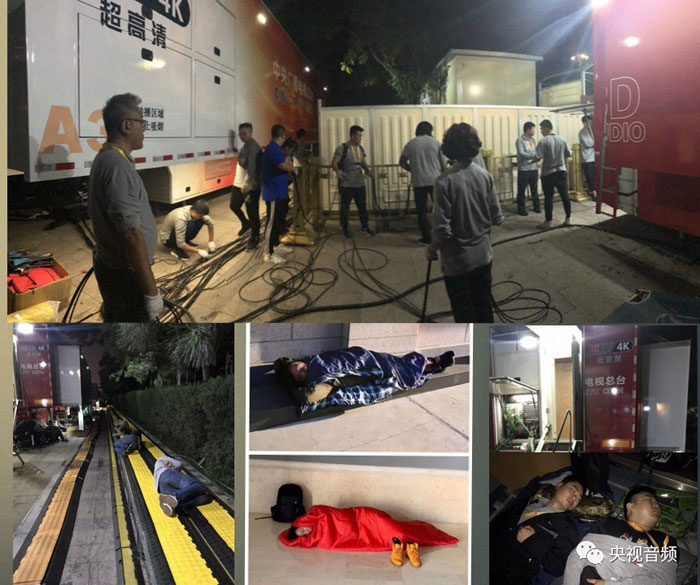 此次活動(dòng)覆蓋區(qū)域極大,由于各系統(tǒng)分區(qū)工作,系統(tǒng)間的線纜級(jí)聯(lián)需要鋪設(shè)大量纜線近30公里。其中使用8根700米長(zhǎng)的光纜(普通光纜每根200米),與現(xiàn)場(chǎng)信號(hào)中心進(jìn)行級(jí)聯(lián)。由于排練期間長(zhǎng)安街相關(guān)區(qū)域并未封閉管理,每次排練都需要重新鋪設(shè),加之工作時(shí)間和人員數(shù)量的限制,每天重新鋪放8條700米光纜的工作強(qiáng)度非常大,恨不得將其一刀兩斷(所有直播結(jié)束后,在系統(tǒng)拆除的時(shí)候錄音師們真的做到了)。有的系統(tǒng)地處核心位置,管控嚴(yán)密,進(jìn)出不便,逢周末閱兵活動(dòng)和聯(lián)歡晚會(huì)兩天演練,錄音師需提前上崗,演練期間不能撤離,結(jié)束撤下來時(shí)已經(jīng)是36小時(shí)以后。國慶大典直播當(dāng)天,為了趕在布放聯(lián)歡晚會(huì)設(shè)施的重型機(jī)械進(jìn)場(chǎng)之前完成轉(zhuǎn)播設(shè)備撤場(chǎng),需要在閱兵結(jié)束后40分鐘之內(nèi),收完總長(zhǎng)幾十公里的線纜,這幾乎是不可能完成的任務(wù),兩個(gè)轉(zhuǎn)播系統(tǒng)的所有人員在閱兵直播信號(hào)切走的一瞬間撲向廣場(chǎng)。