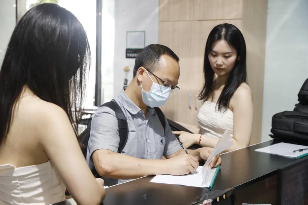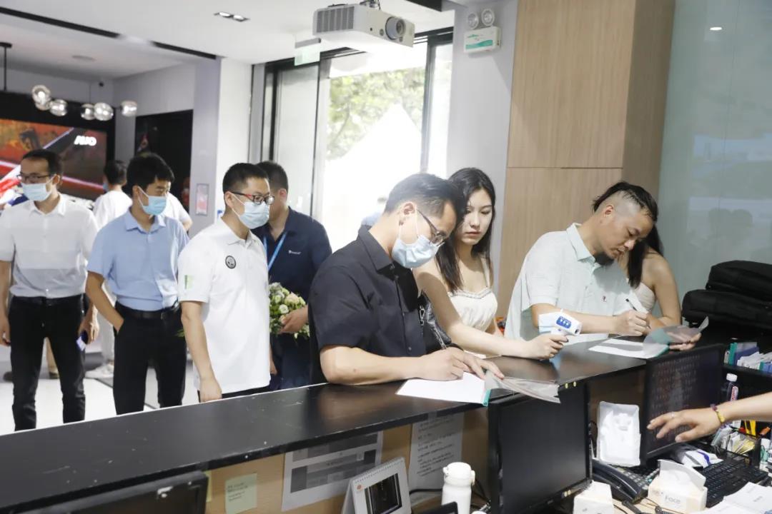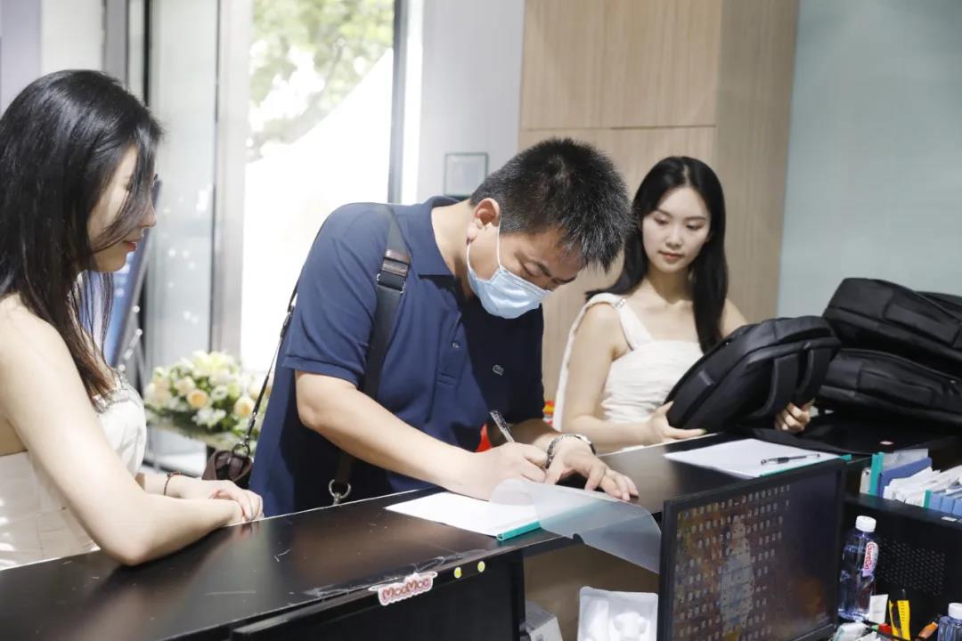 工作人員和禮儀小姐一道為客戶遞上
