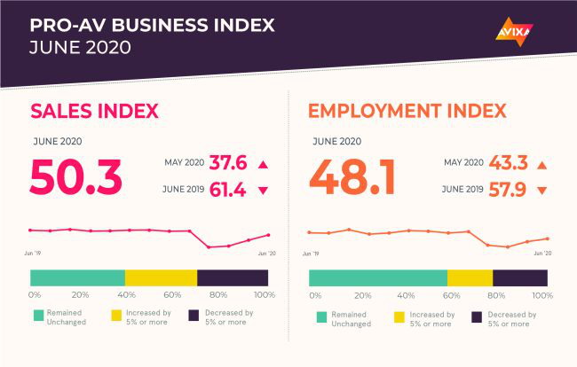 AVIXA的最新專業(yè)音視頻商業(yè)指數(shù)顯示該行業(yè)正處于復(fù)蘇之路。 由于受Covid-19的影響,專業(yè)影音銷售和就業(yè)在經(jīng)歷了三個(gè)月的下降后均達(dá)到了中性條件。