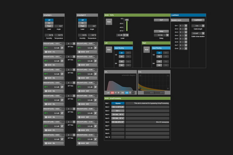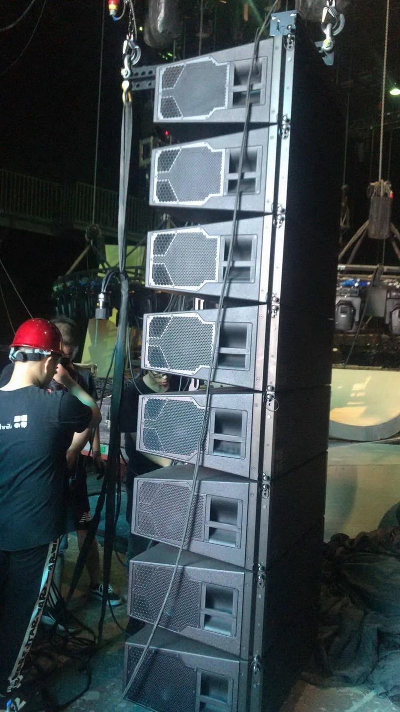主擴(kuò)系統(tǒng)采用了16只KSL8線陣列全頻音箱,這是專門為中大型擴(kuò)聲需要而設(shè)計(jì)的。KSL8具有 80° 水平覆蓋,在類似尺寸的線陣列模塊中獨(dú)具特色,可在最低頻率下提供一致的指向性控制。兩個(gè)前向10"驅(qū)動(dòng)單元和兩個(gè)側(cè)向8"驅(qū)動(dòng)單元的幾何形狀相互配合并使用心型技術(shù),創(chuàng)建精確的頻率帶寬指向性控制,并顯著擴(kuò)展朝向觀眾的低頻動(dòng)態(tài)余量。中頻由一個(gè)裝有8"驅(qū)動(dòng)單元的高靈敏度號角提供,而安裝在波導(dǎo)裝置上的兩個(gè)創(chuàng)新定制型3"音圈高頻驅(qū)動(dòng)單元可提供高頻分辨率和輸出。