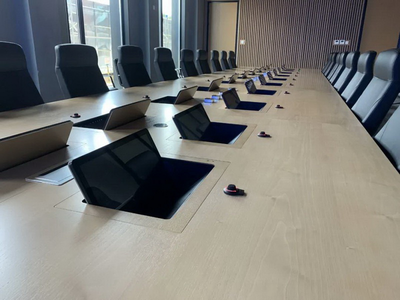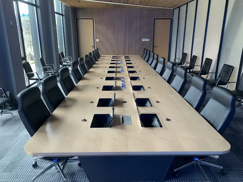 2、會(huì)議桌有升降式觸摸屏,既要配合好無(wú)紙化,話筒拾音必須達(dá)到最佳效果,無(wú)雜音。
