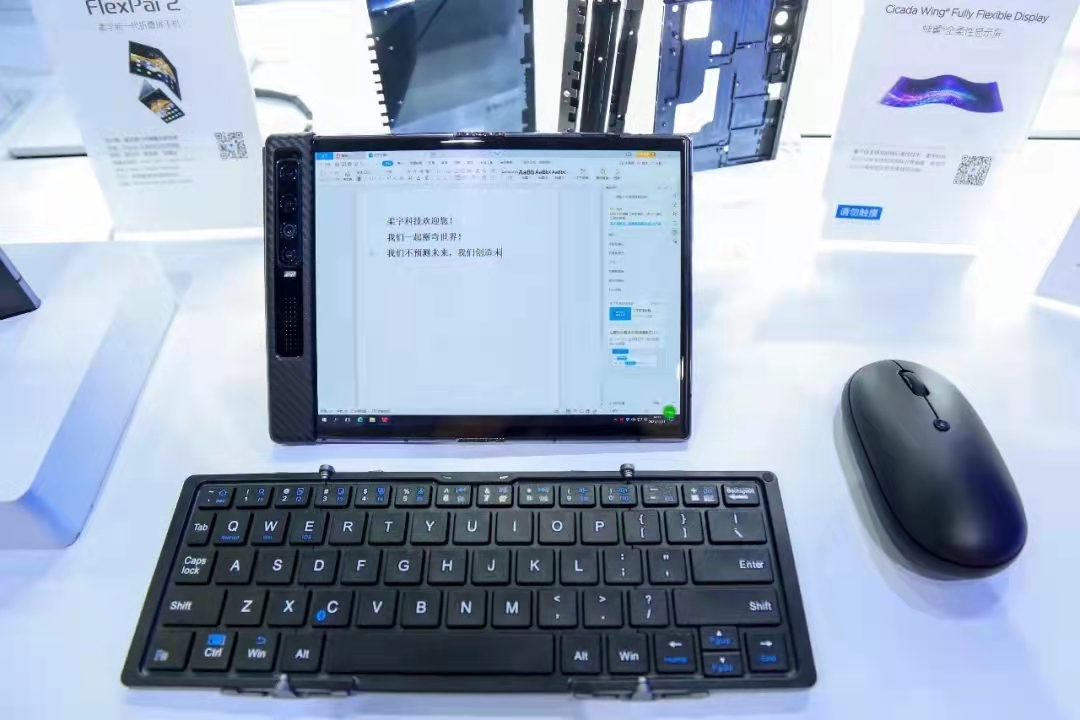 在博覽會(huì)現(xiàn)場,能夠看到柔宇帶來的眾多柔性電子創(chuàng)新產(chǎn)品:折疊屏手機(jī)FlexPai 2、智能手寫本RoWrite 2、RoMeeting智能會(huì)議銘牌系統(tǒng)、柔樹、柔性車載顯示解決方案等……吸引了眾多參觀者圍觀。